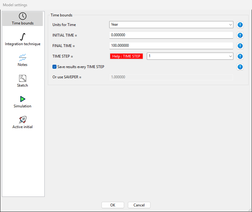 What is left is defining the boundary parameters. For this model, we need to edit INITIAL TIME, FINAL TIME and TIME STEP. If you have not done this at the beginning when creating the model, you can now go back to it via Model $\rightarrow$ Settings and edit INITIAL TIME = 2000, FINAL TIME = 2050, and TIME STEP = 1. Make sure that for all variables and boundary conditions the unit is set to Year. You should save now the model and run the simulation. To do so, hit the