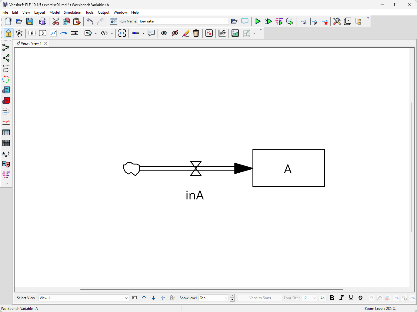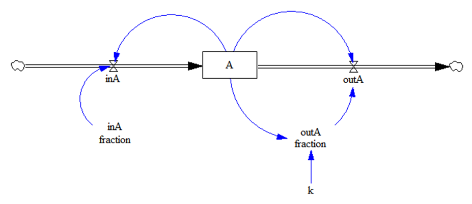 and place it in the sketch. Connect the flow to the stock by clicking on the stock first and then on the flow. You can double-click on the flow to edit its name. Name it in_A. Your model should look like the example below:
