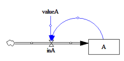 In this exercise we add complexity to simple flow models by adding auxiliary variables as well as causal links to the model. To do that, repeat what we did in exercise I and implement stock A and flow in_A in the same way (however: do not specify them yet!). Afterwards add an auxiliary variable valueA and a causal link (blue arrows) by clicking on the respective from and to element in the sketch (Hint: curved arrows are created by clicking on the from-element, then on an empty spot on the sketch, then on the to-element). Do this between A and inA and between valueA and in_A. Your model should look similar to the one below: